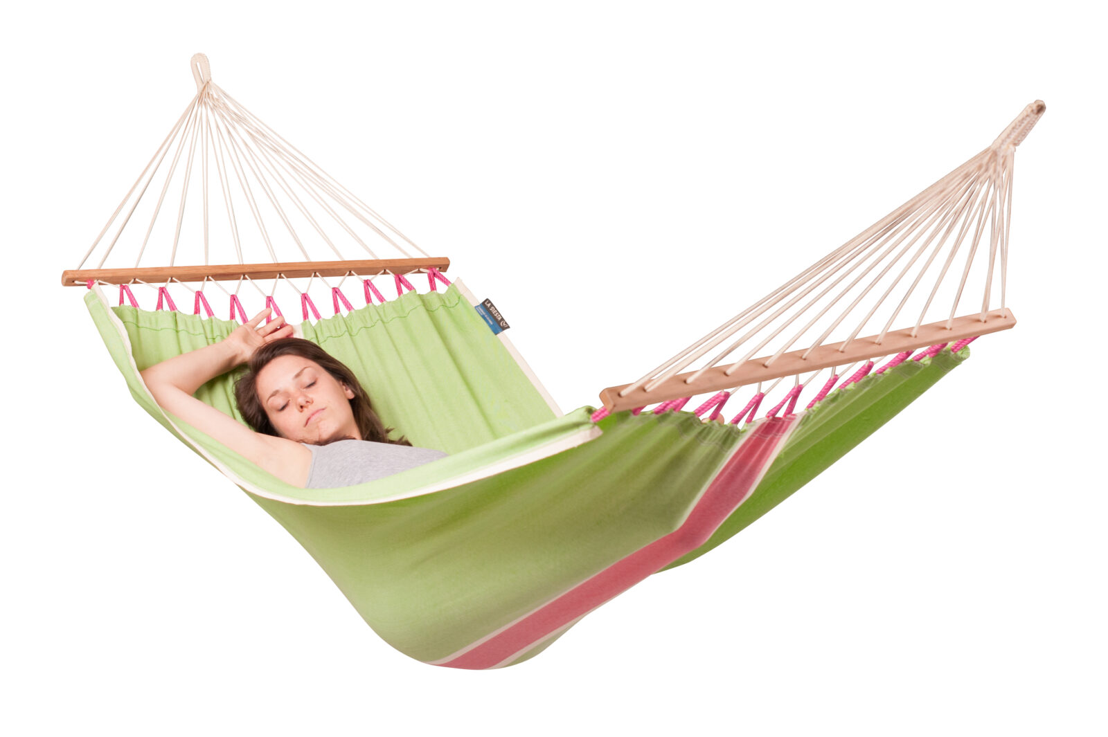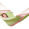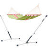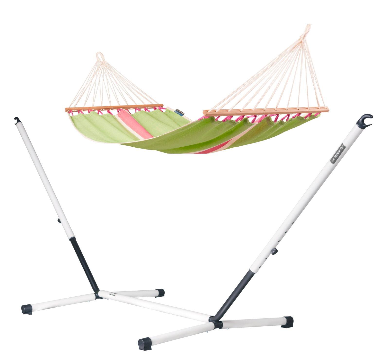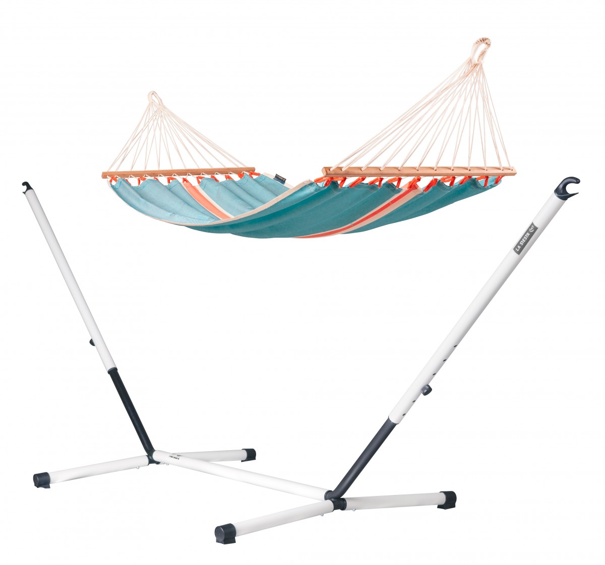 Convenience and classy looks collide in this rather fetching two piece. We have our old favourite, the Beachlife hammock with it’s slightly deck-chair looks and it’s weatherproof Hamatex fabric (it feels like cotton), the quality of this hammock is easy to see from the detail in the stitching and the fabric loop to the bamboo spreader bars. It’s a nice one. Full details here