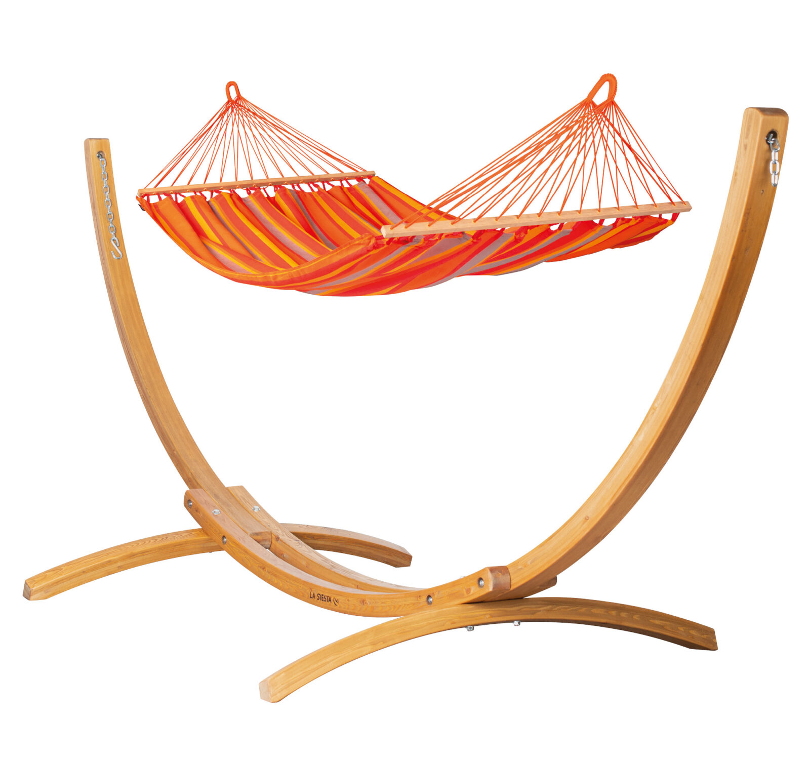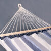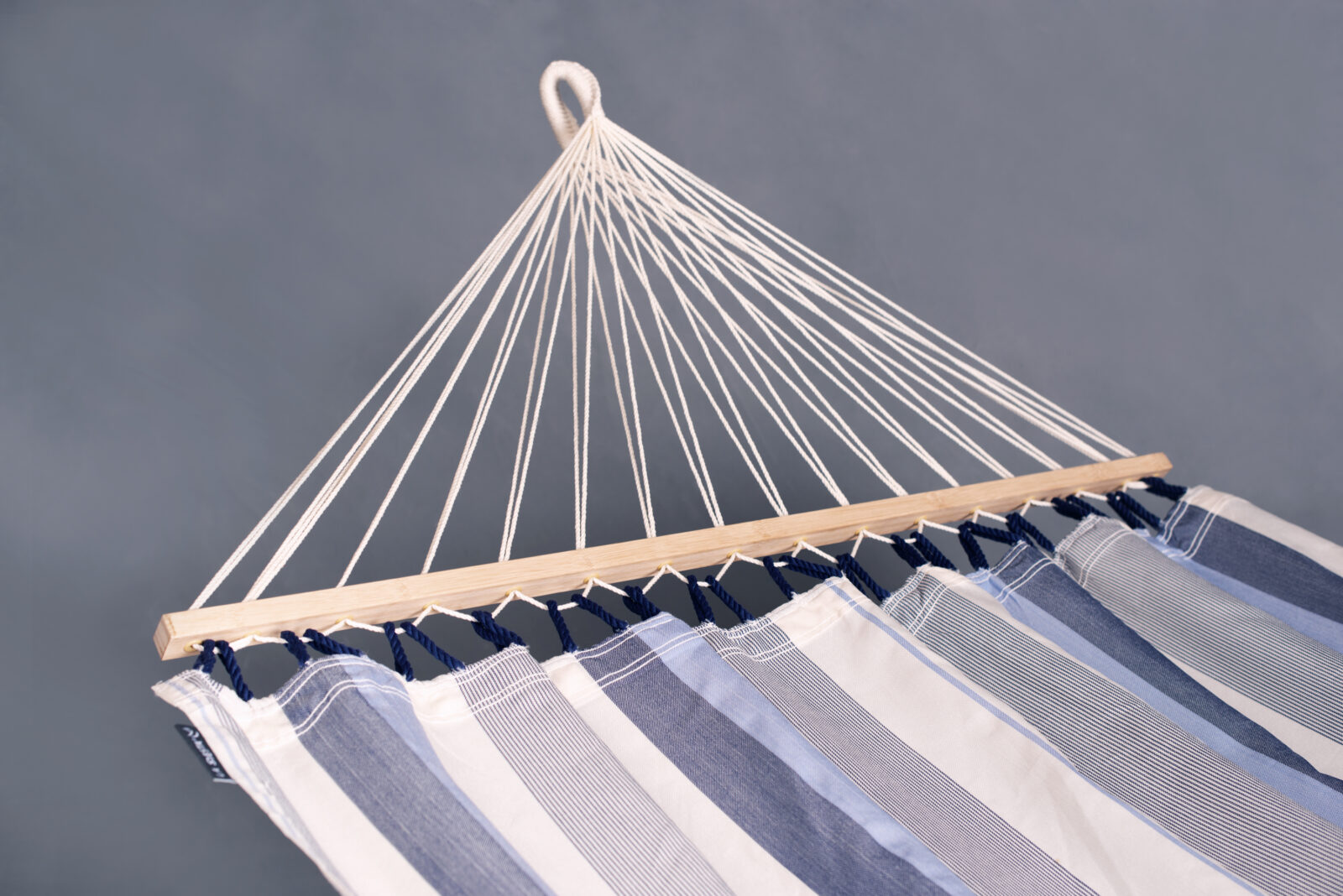 The hammock is made from a synthetic fabric which makes it more suitable for outdoor use than a cotton hammock, despite being synthetic it still has a nice feel to it, not at all plasticky. The spreader bars are laminated bamboo from sustainable sources and have excellent strength and rot resistance. Having wider bars than most spreader bar hammocks this hammock is more stable than others. It is big enough for two adults so long as you’re good friends.