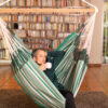 So, on the technical side here’s a few things to look at. Firstly, it’s made from 100% GOTS certified organic cotton which is both soft to the touch and hard wearing. It has a FSC forestry managed bamboo bar (bamboo is both strong, rot resistant and unlikely to warp). The edges of the fabric (the selvages) are reinforced to prevent fraying and it has a integrated stainless steel swivel, the point of the swivel is so that when you turn to face in a particular direction the twist on the rope doesn’t bring you back.