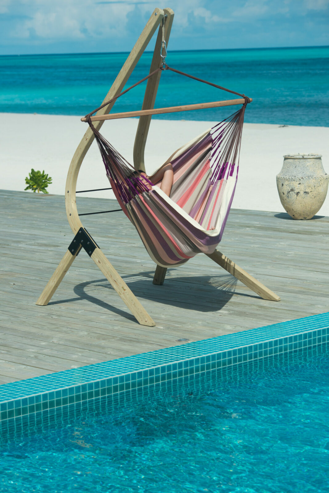 Don’t you just love it when stuff gets cheaper? From our good friends at La Siesta comes a new version of their wooden hanging chair stand and for once the clever designers have managed to make something similar which is both more universal (nearly all hanging chairs fit on it) and costing less. So we have passed the savings on to you.