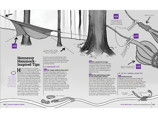 From chapters on different bits of gear: tarps, underquilts, hanging systems and styles and brands of hammocks available, to technical chapters showing the fanciest hammock knots we have ever seen through to killer advice on how to make yourself comfortable and warm, it truly is a brilliantly researched book.