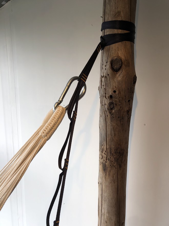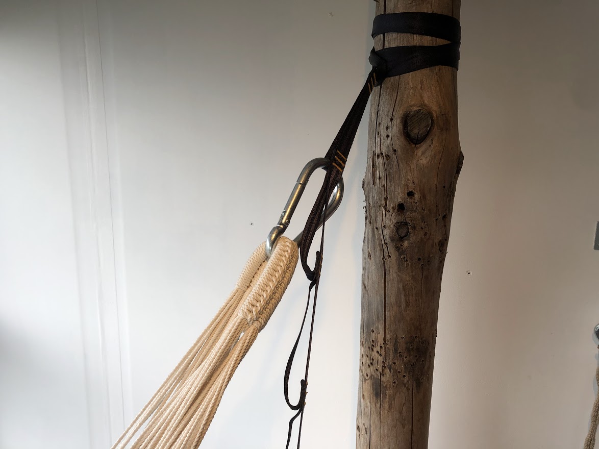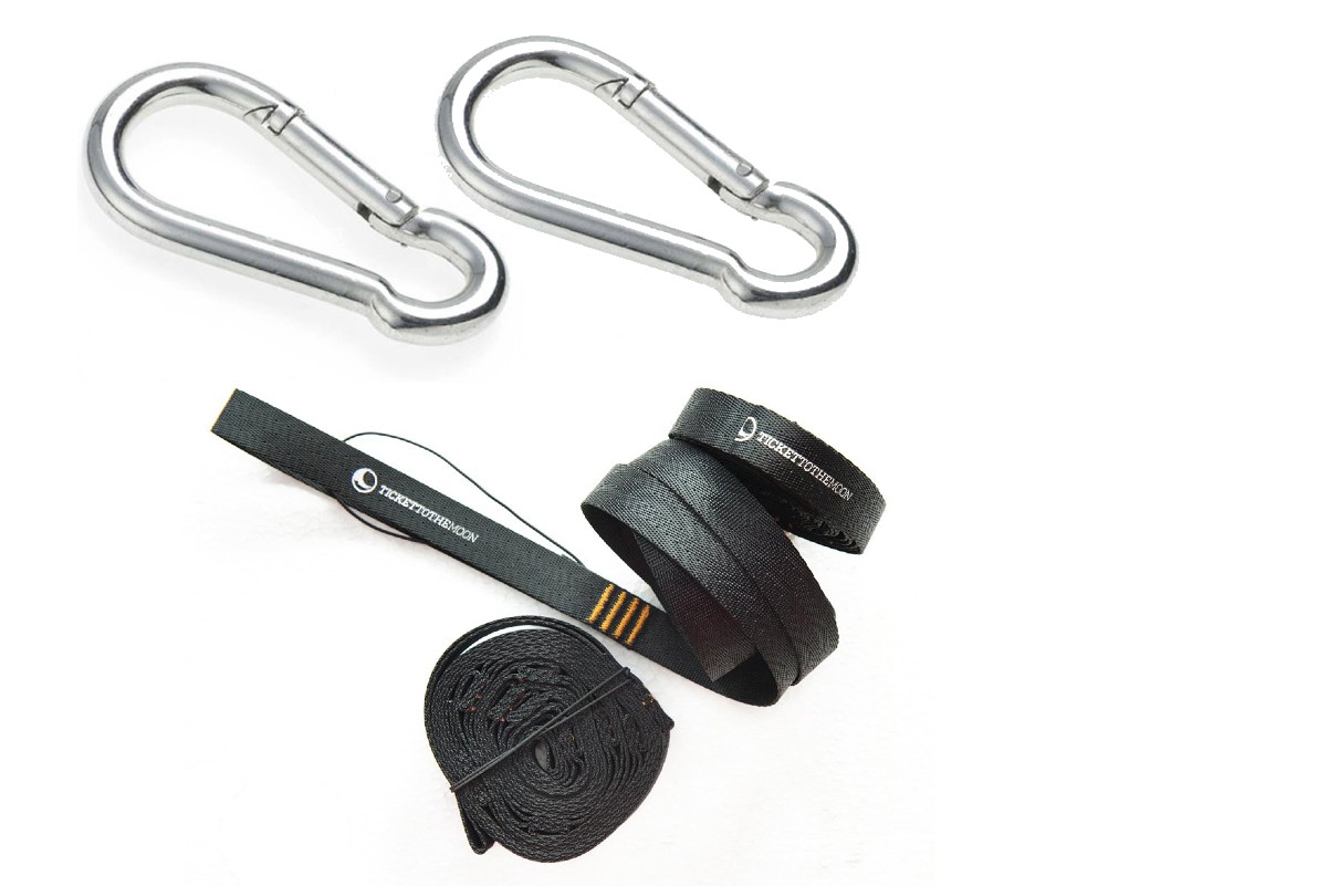 We have combined Ticket to the Moon’s clever and well made Moonstraps with a pair of carabiners, big chunky ones that can fit into the loop at the ends of most hammocks (Ticket to the Moon hammocks don’t need carabiners as they have S hooks on the ends). This makes setting up, taking down or adjusting the hammock really simple and secure.